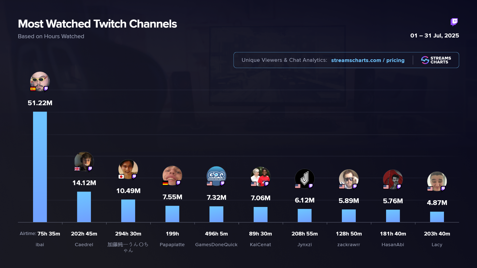 As expected, Ibai topped the list of the most-watched Twitch channels in July, pulling in over 51.2 million Hours Watched — largely thanks to La Velada del Año V. That said, even without the boxing event, the Spanish streamer likely would’ve secured a spot in the top 10.
