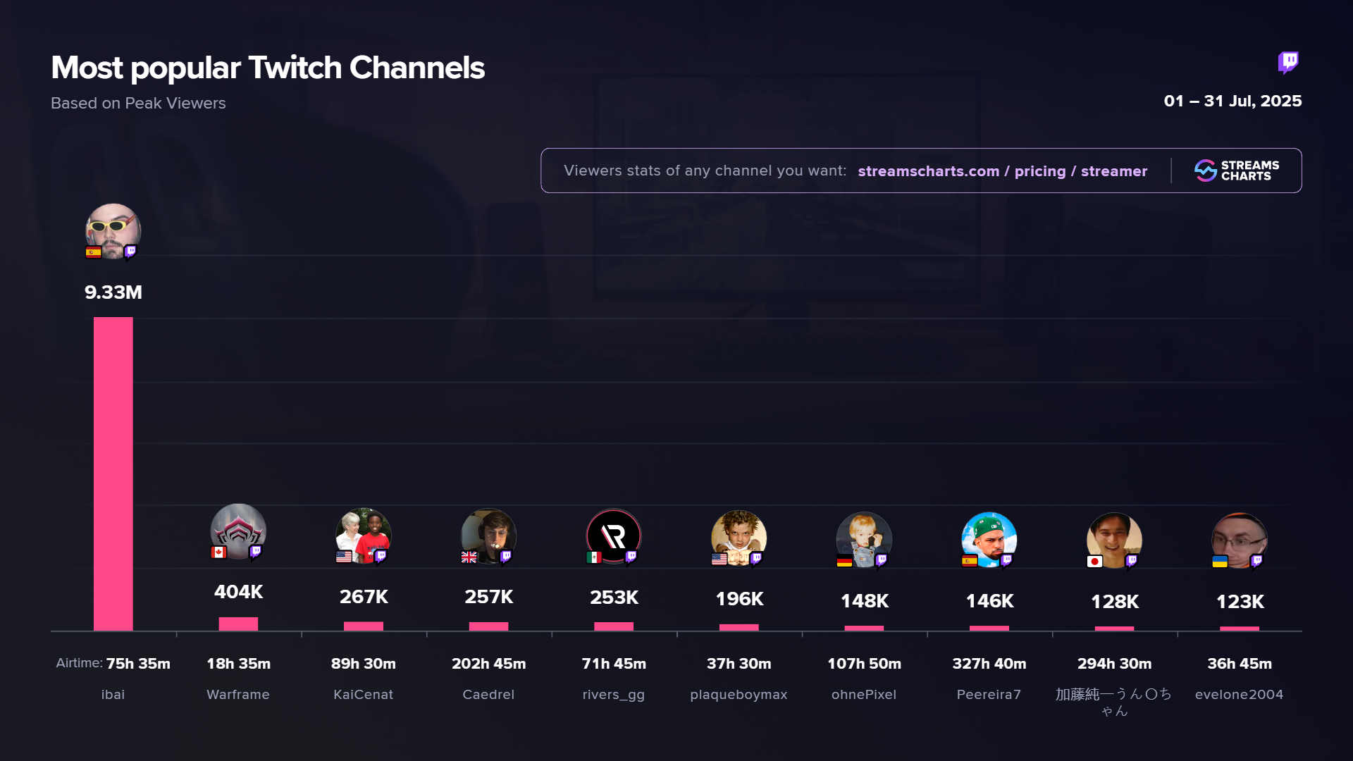 It’s no surprise that Ibai also topped the list of Twitch channels by peak concurrent viewers. With a peak audience of 9.3 million, he not only broke his own record but also became the most-popular streamer worldwide across all platforms.