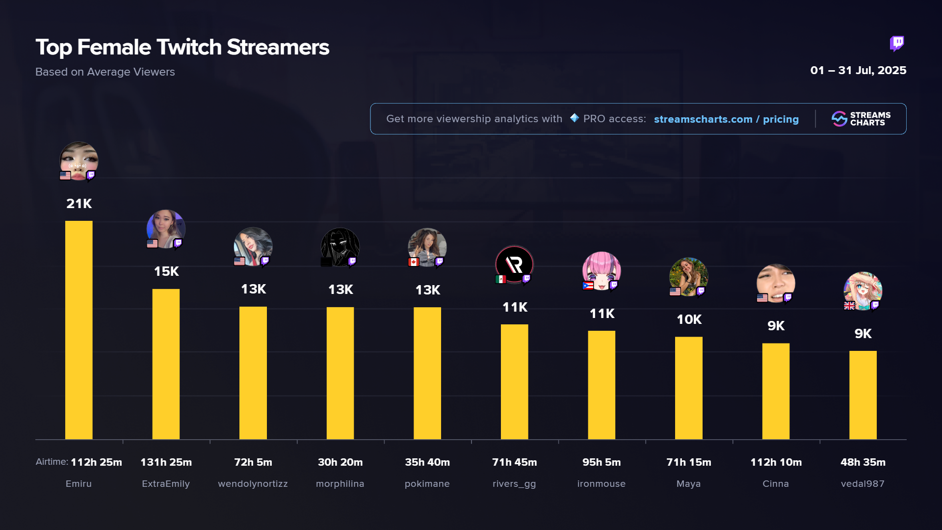 Emily Beth "Emiru" Schunk, from the OTK Network, held onto her spot as the top female streamer of the month. She improved on her June average viewer count and has now clearly pulled ahead of the competition.