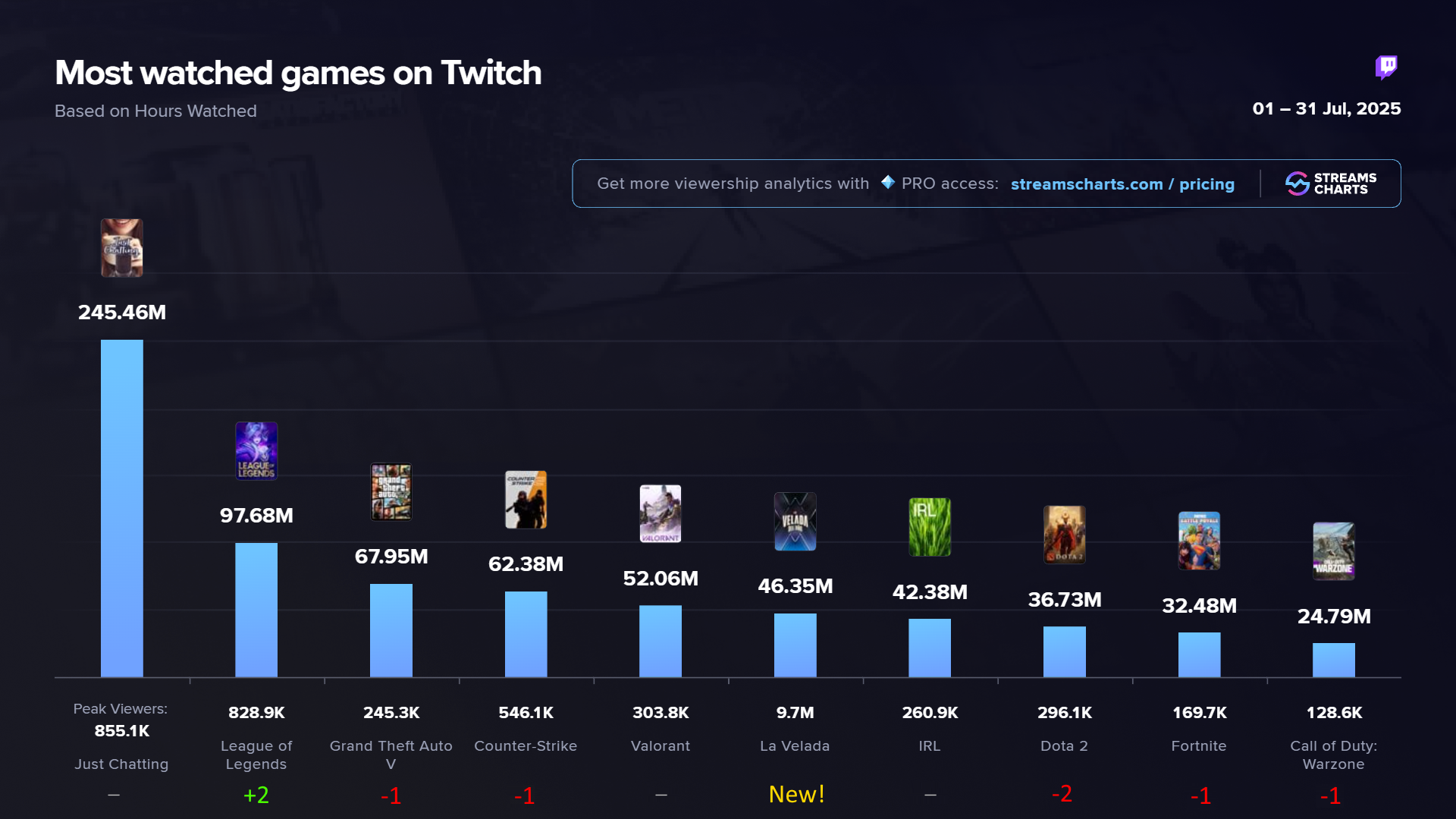 Elsewhere in the rankings, League of Legends reclaimed its usual spot at the top of the most-watched games list. The title jumped two places in July, boosted by esports broadcasts of MSI 2025 and EWC 2025 — both tournaments attracted massive audiences and reignited interest among League fans.