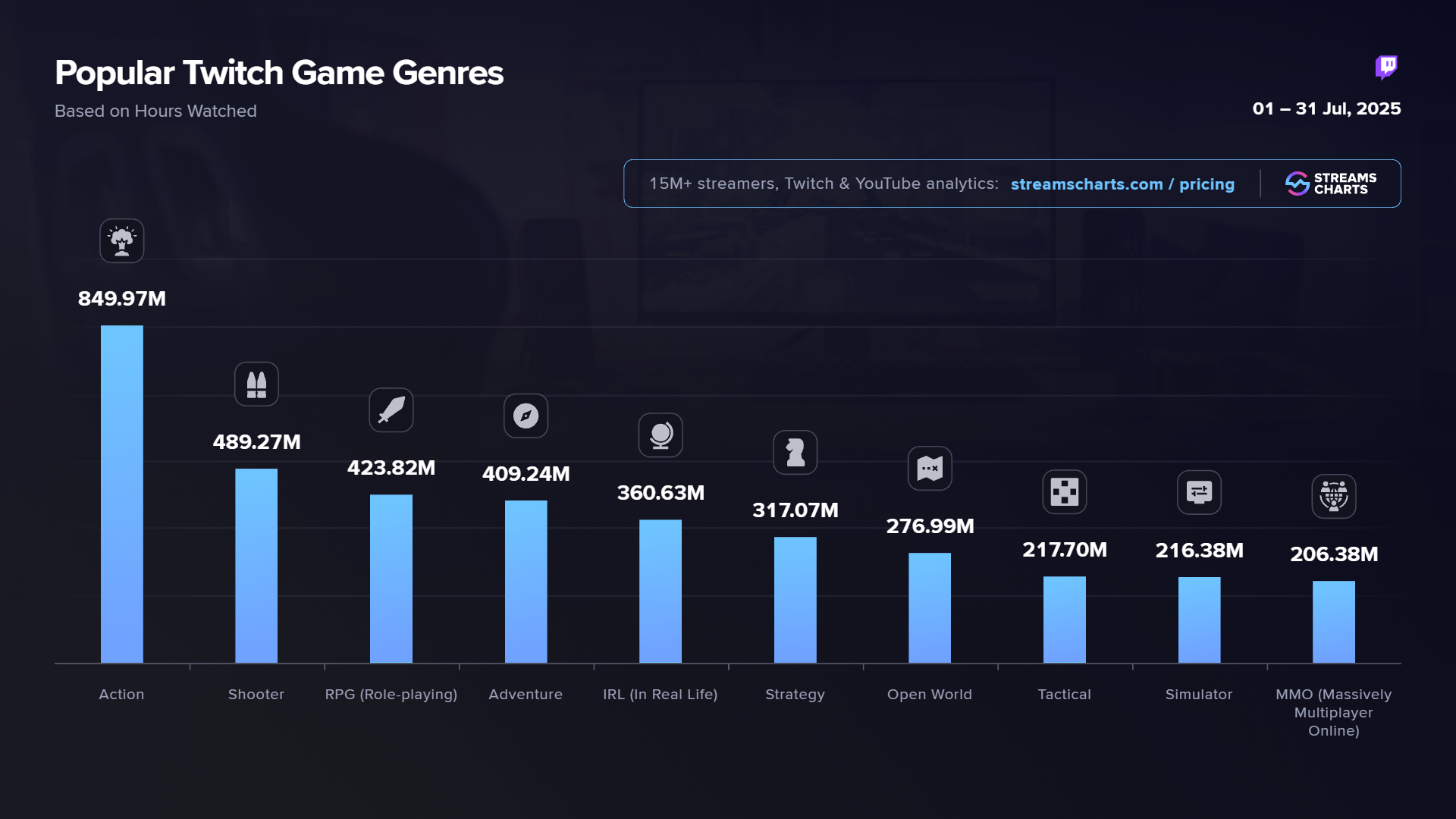 Shooter and RPG ranked second and third, each drawing about half the viewership of the leading genre. Surprisingly, MMO landed at the bottom of the top 10 — despite being tied to major titles like Minecraft, World of Warcraft, and Rust.