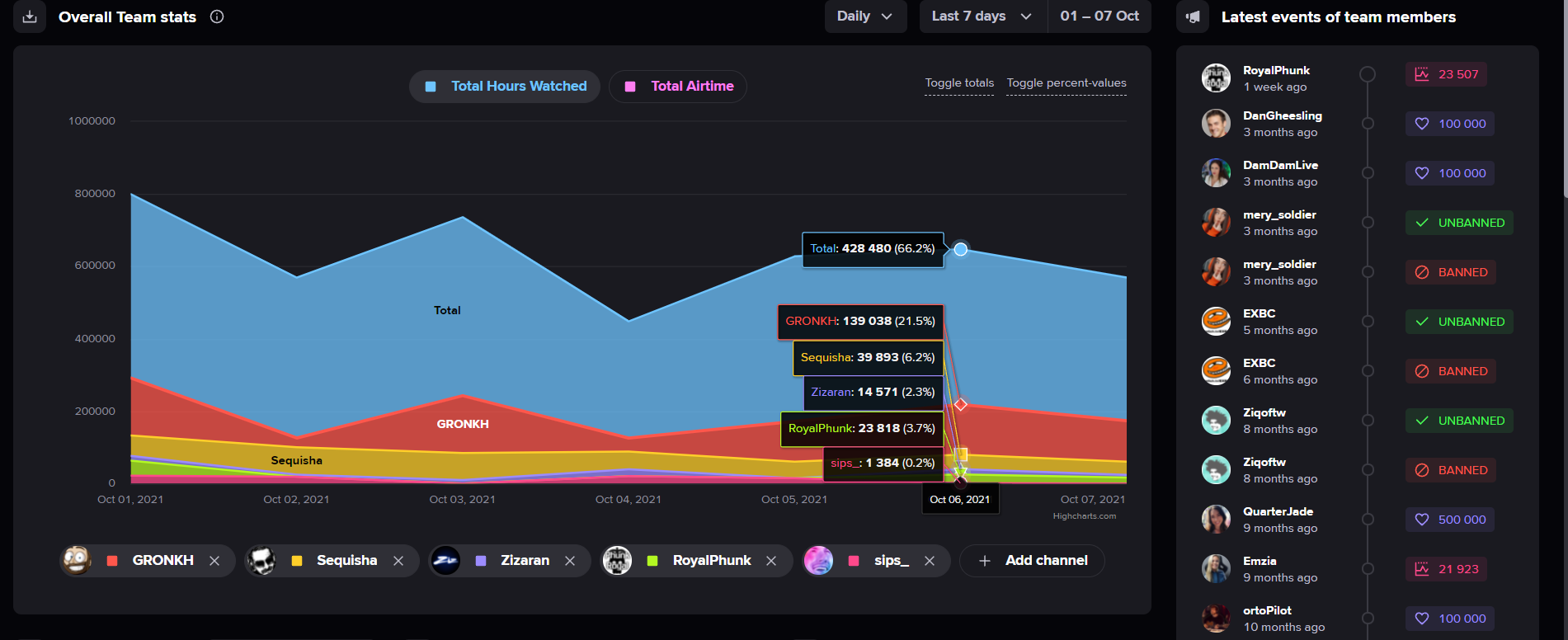 Latest events of team/list members. Latest achievements of team or list channel members. Peaks of viewers, round numbers of followers and bans.