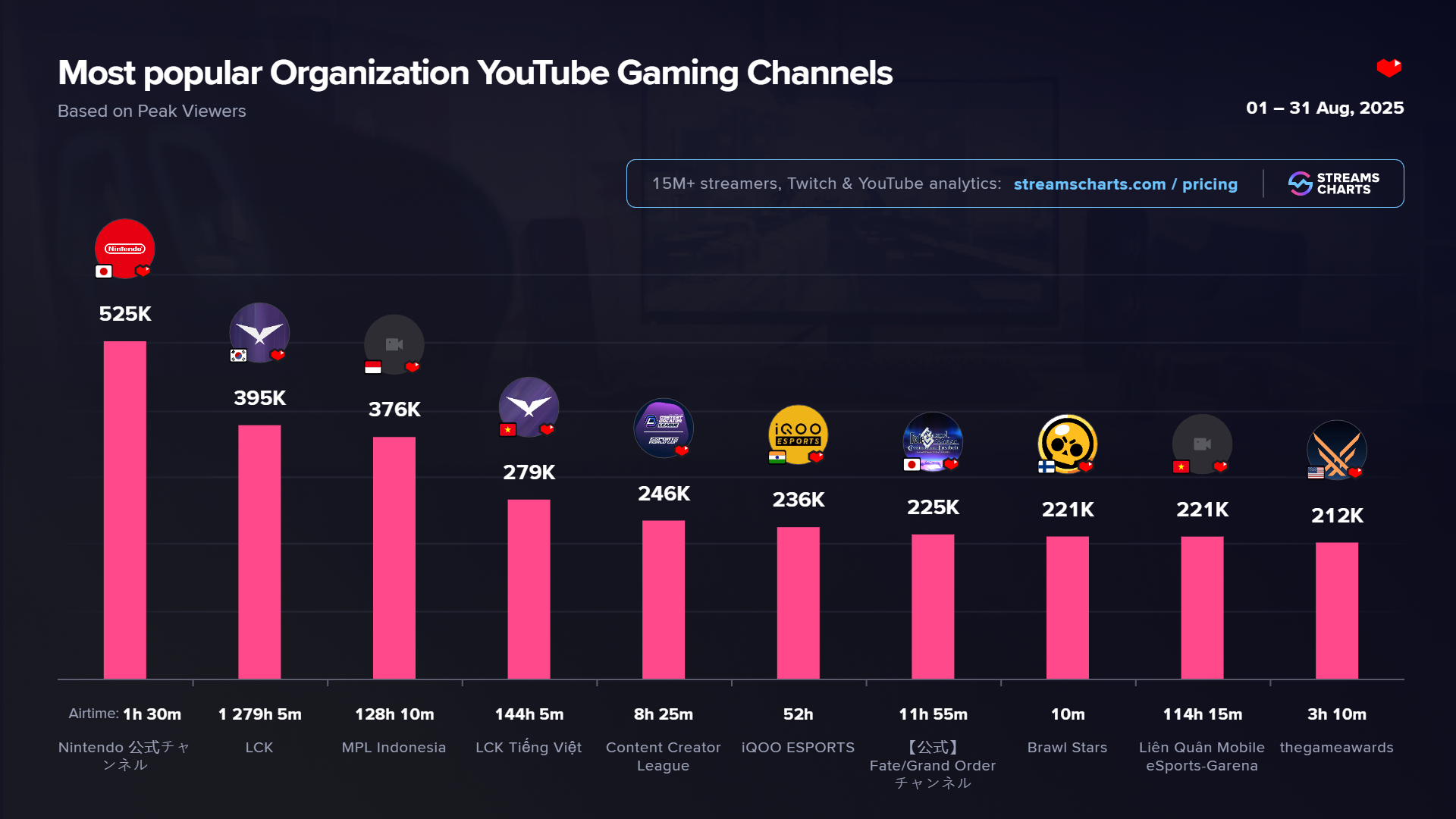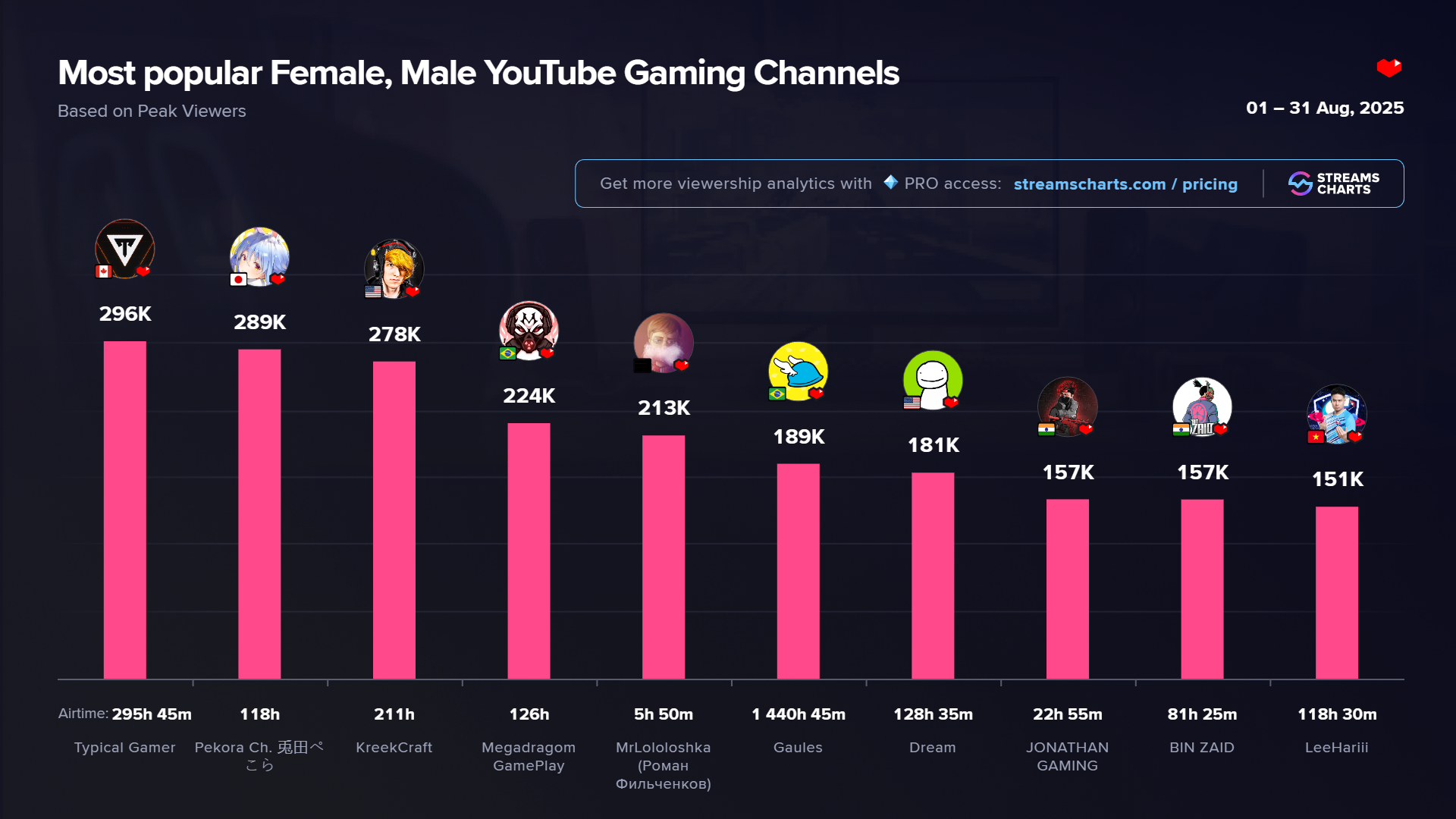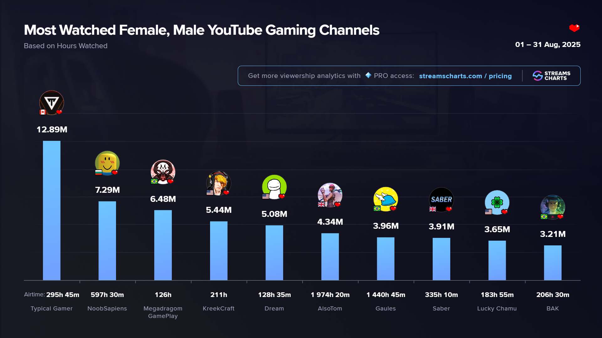 August was packed with viral livestreaming content on YouTube Gaming. Game publishers and showcase organizers presented new releases, while esports tournaments and influencers skillfully capitalized on the hype surrounding major game updates. In this article, Streams Charts highlights the platform’s leading channels across two key viewership metrics: Hours Watched and Peak Viewers.