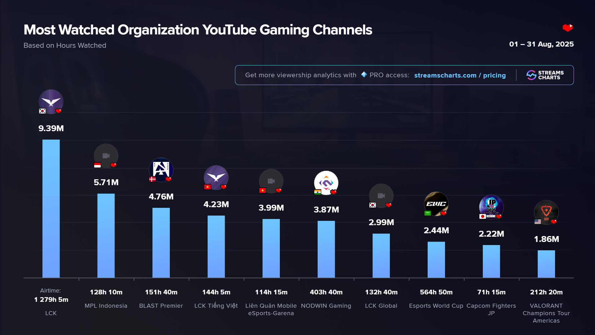 At the very top, well ahead of the rest, stood the main channel of Korea’s League of Legends circuit, the LCK. Known for streaming multiple matches simultaneously, the channel is a regular fixture at the top of our rankings, and August was no exception. The month’s numbers were further boosted by the highly anticipated T1 vs. Gen.G derby, a head-to-head clash between the region’s two most popular teams.