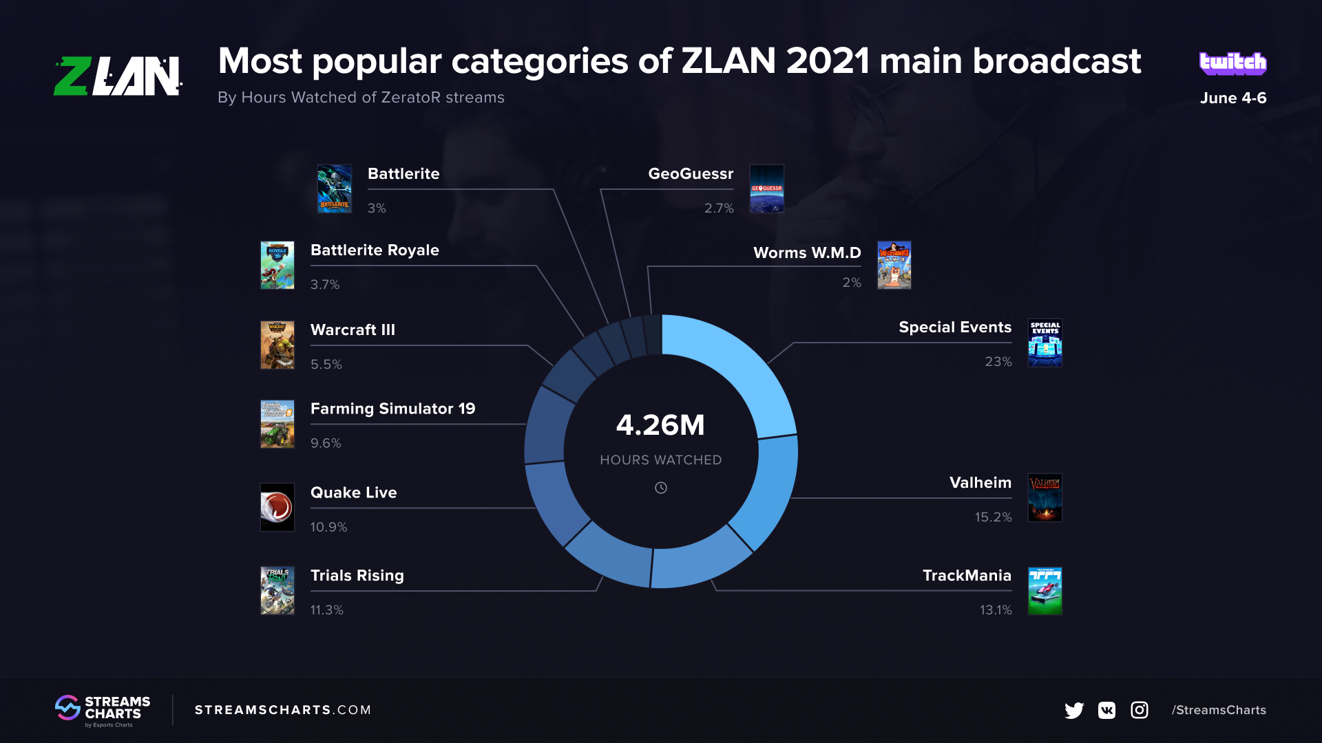 Out of 11 categories broadcasted on ZeratoR’s stream during the event, the most-watched was the Special Events category, which included all the non-competitive parts of the broadcast, as well as the grand final in pétanque (physical game). The category saw the highest volume of spectators, bringing in 978K Hours Watched — 22.97% of the total HW on ZeratoR’s stream.