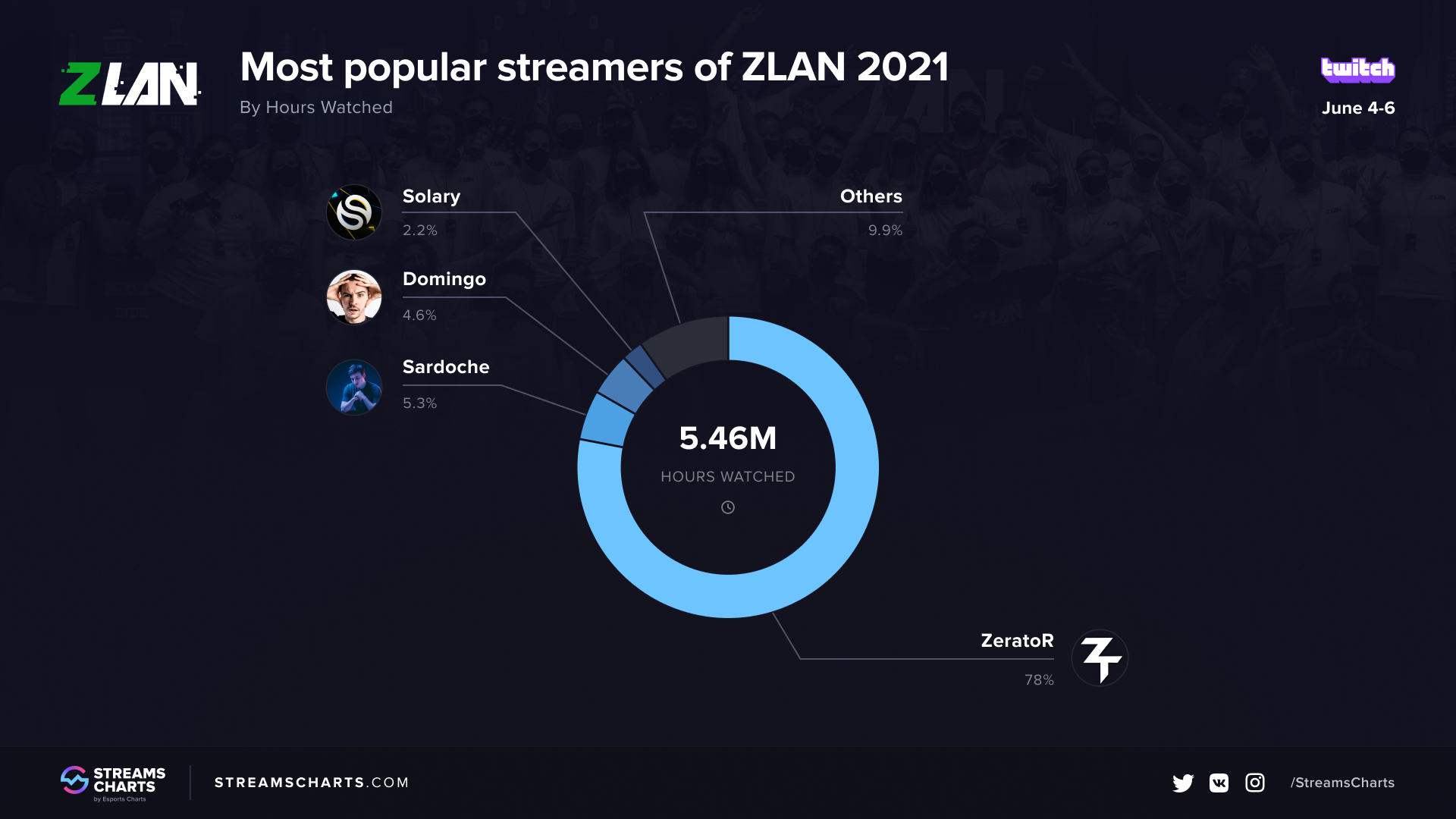 Many streamers were among the ZLAN’s participants, although ZeratoR had a significant lead all the way through the competition. His channel hosted the official broadcast of the tournament and brought in 4.25M Hours Watched, which is 77.96% of the total HW.