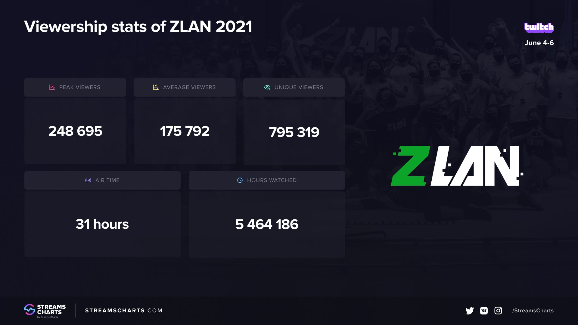 Compared to last year’s online edition, the viewership performance of ZeratoR’s gaming marathon is showing slight growth in popularity. The event peaked at 248K Peak Viewers, which is a 21.89% increase compared to last year. During 31 hours of Air Time, the event gathered 5.46M Hours Watched — 38.64% more than the 2020’s edition.