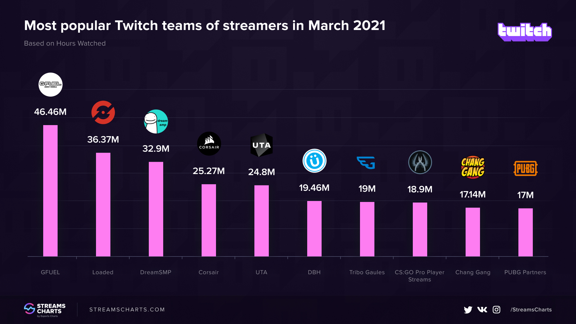 Тройку лидеров замкнуло сообщество майнкрафтеров DreamSMP. Традиционно самыми просматриваемыми участниками группы стали RanbooLive (8,76 млн часов просмотра), Tubbo (5,6 млн), Philza (3,74 млн), karljacobs (3,68 млн) и tommyinnit (2,42 млн). Последний пробыл в эфире всего 9,5 часов в марте.